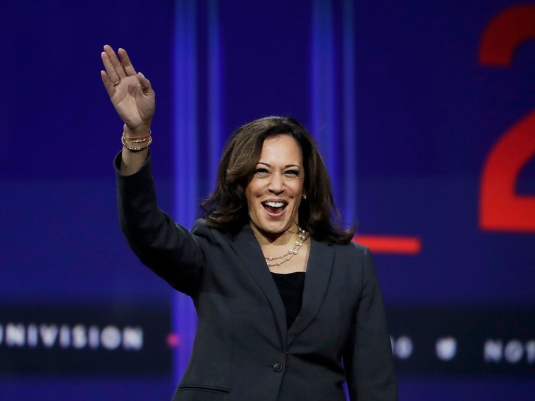 (Photo: Sen. Kamala Harris, D-Calif., takes the stage at a campaign stop at Keene State College in Keene, N.H., in April 2019 - Brian Snyder / Reuters / via CapRadio)