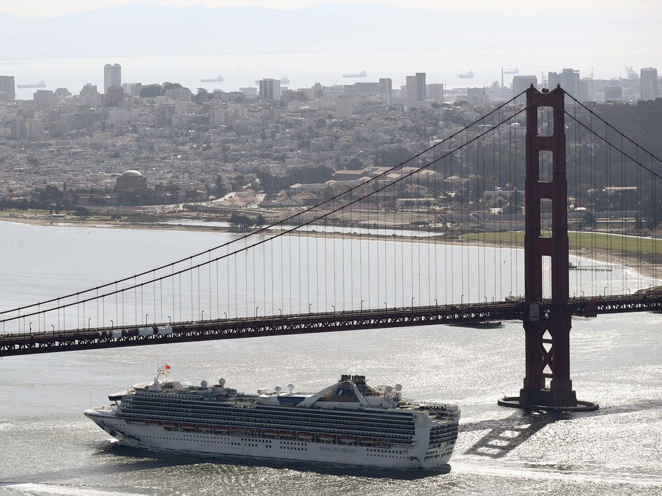 (Photo: The Grand Princess cruise ship heads under the Golden Gate Bridge to a port in Oakland, Calif., on Monday. The ship's more than 2,400 passengers are headed to either medical care or quarantine due to the coronavirus - Ezra Shaw / Getty Images / via CapRadio)