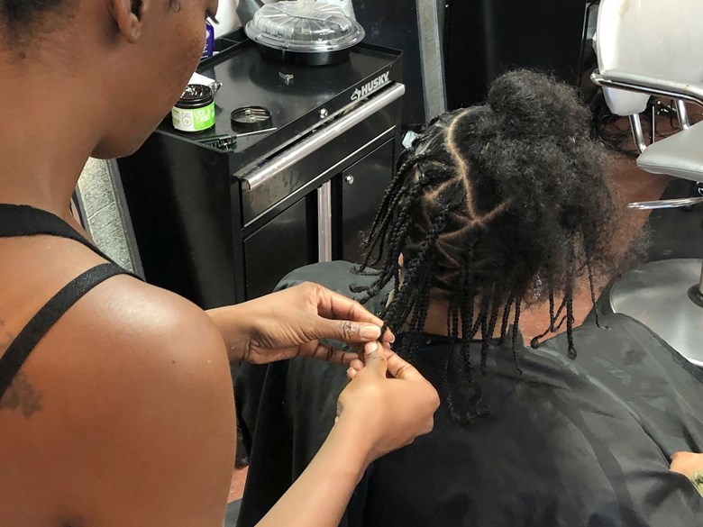 (Photo: Shana Bonner, left, styles the hair of Pho Gibson at Exquisite U hair salon in Sacramento, Calif., Wednesday, July 3, 2019 - Kathleen Ronayne / AP Photo / via Cap Radio)