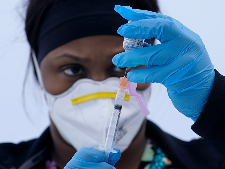 (Photo: Licensed vocational nurse Jelisa Stewart prepares a dose of the Moderna COVID-19 vaccine for farmworkers at a County of Santa Clara mobile vaccination clinic at Monterey Mushrooms in Morgan Hill, Calif., Wednesday, March 3, 2021 - AP Photo/Jeff Chiu).