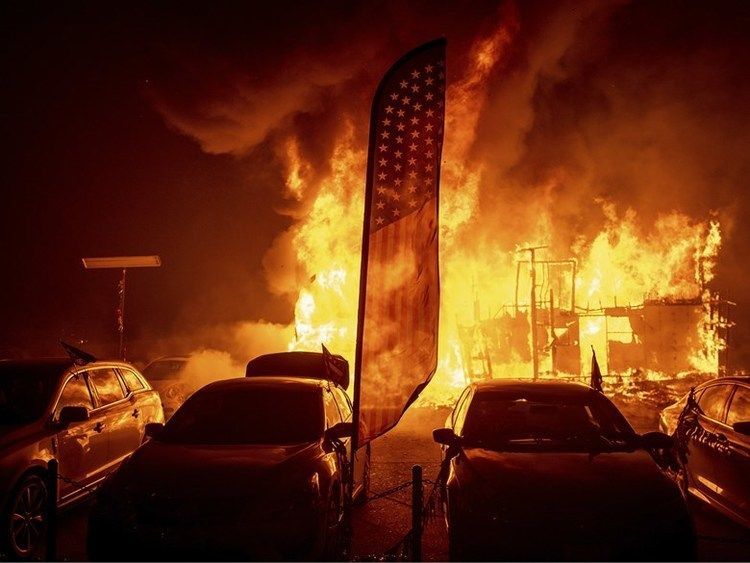 (Photo: Flames consume a car dealership as the Camp Fire tears through Paradise, Calif., on Thursday, Nov. 8, 2018. Tens of thousands of people fled a fast-moving wildfire Thursday in Northern California - Noah Berger / AP Photo / via Capital Public Radio)