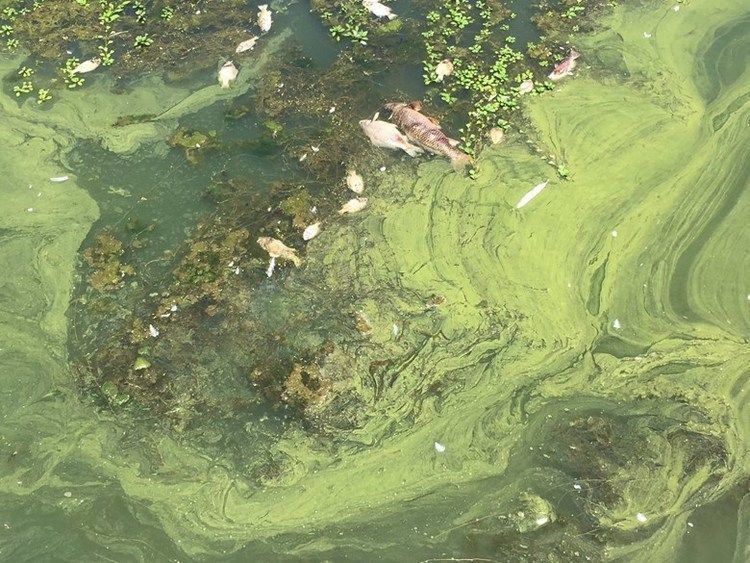 (Photo: A blue-green algae (cyanobacteria) bloom at Clear Lake, Lake County, California, resulted in oxygen depletion in the water and the subsequent mortality of multiple aquatic species, including carp, catfish, bluegill and crappie – Courtesy of California Department of Fish and Wildlife)