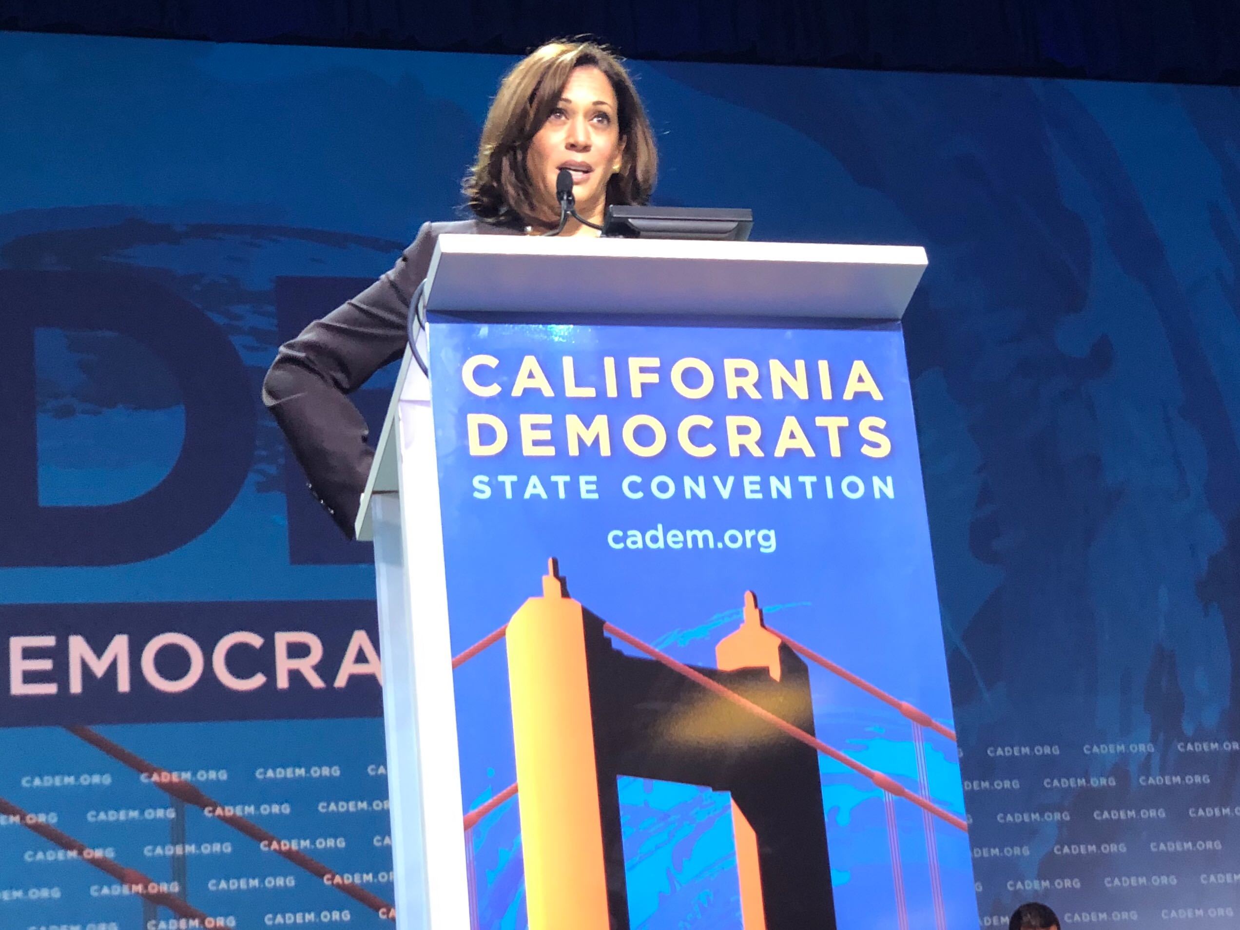 California Sen. Kamala Harris speaks at the California Democratic Party Convention in San Francisco on June 1, 2019. Credit: Capital Public RadioCalifornia Sen. Kamala Harris claimed President Trump’s tariffs are “taking $1.4 billion out of working people’s pockets every month.” PolitiFact California rated this Mostly True.