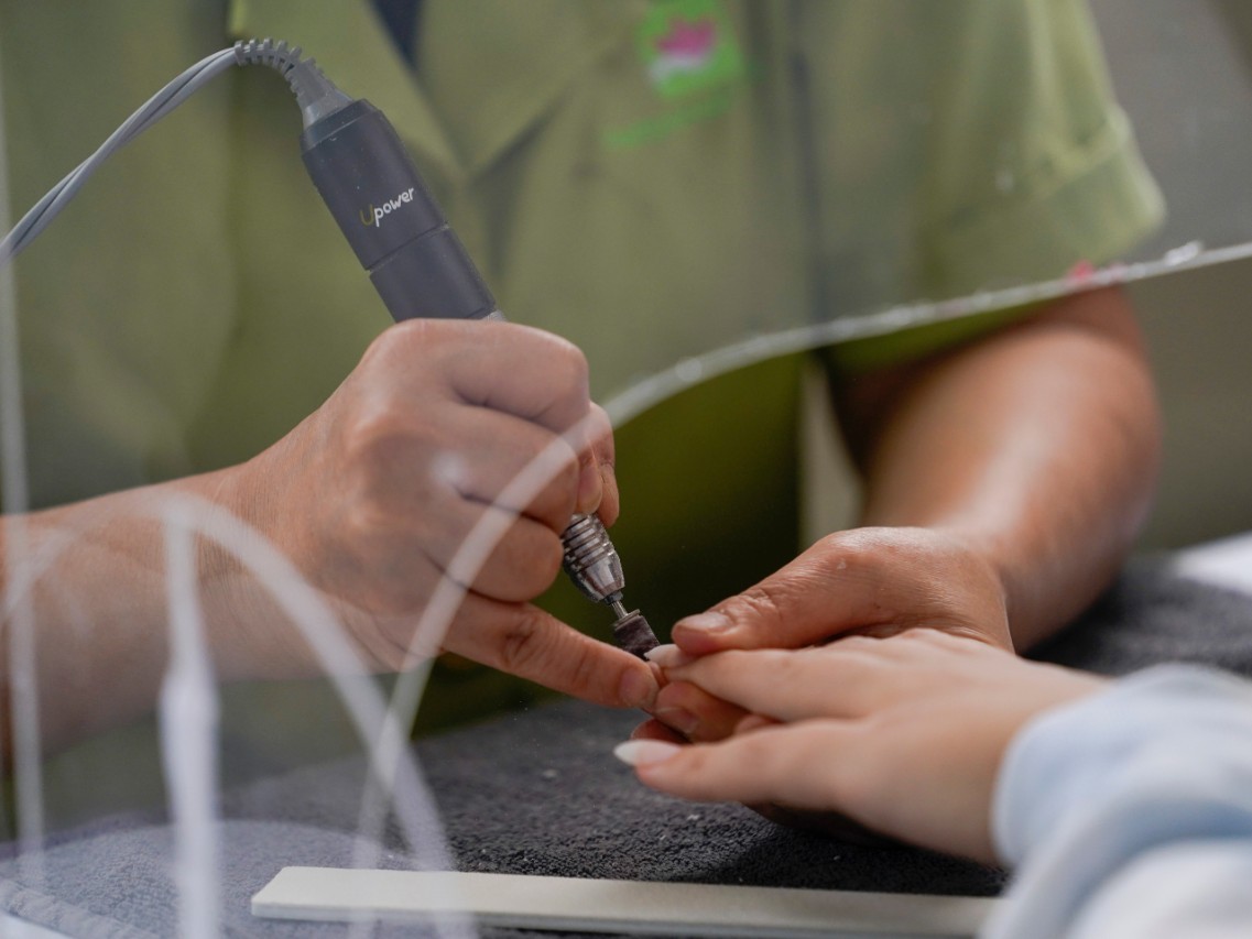 (Photo: A beauty salon employee works on a customer's nails from under a plexiglass shield outside Pampered Hands nail salon on Wednesday, July 22, 2020, in Los Angeles - Ashley Landis / AP Images).