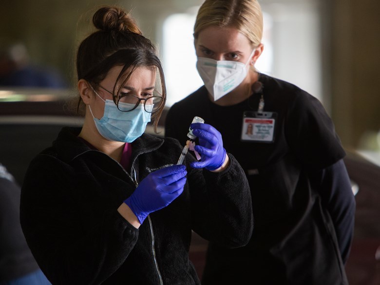 (Photo: California Army National Guard Medic Jenny Rafailov prepares syringes with the Moderna COVID-19 vaccine on Thursday, Jan, 21, 2021 while nurse Katherine Ambrose watches. Andrew Nixon / CapRadio)