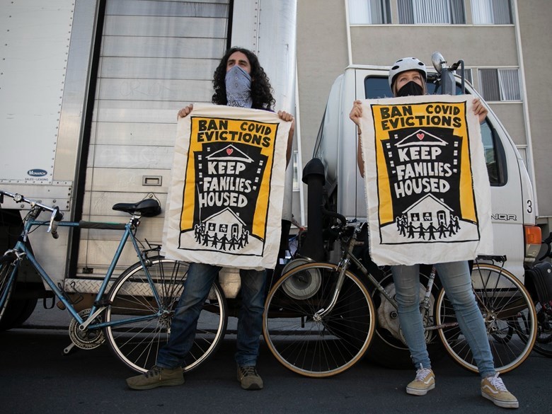 (Photo: Galen Mancino, left, and Betsy Kinsey, hold up banners during a housing justice demonstration in the Adams Point neighborhood of Oakland on Dec. 5, 2020 - Anne Wernikoff / CalMatters).