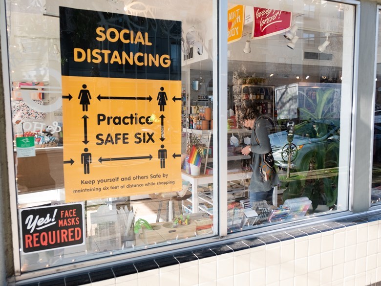 (Photo: Kate Burkhalter arranges products at a store in Midtown Sacramento Wednesday Jan. 13, 2021 - Andrew Nixon / CapRadio).
